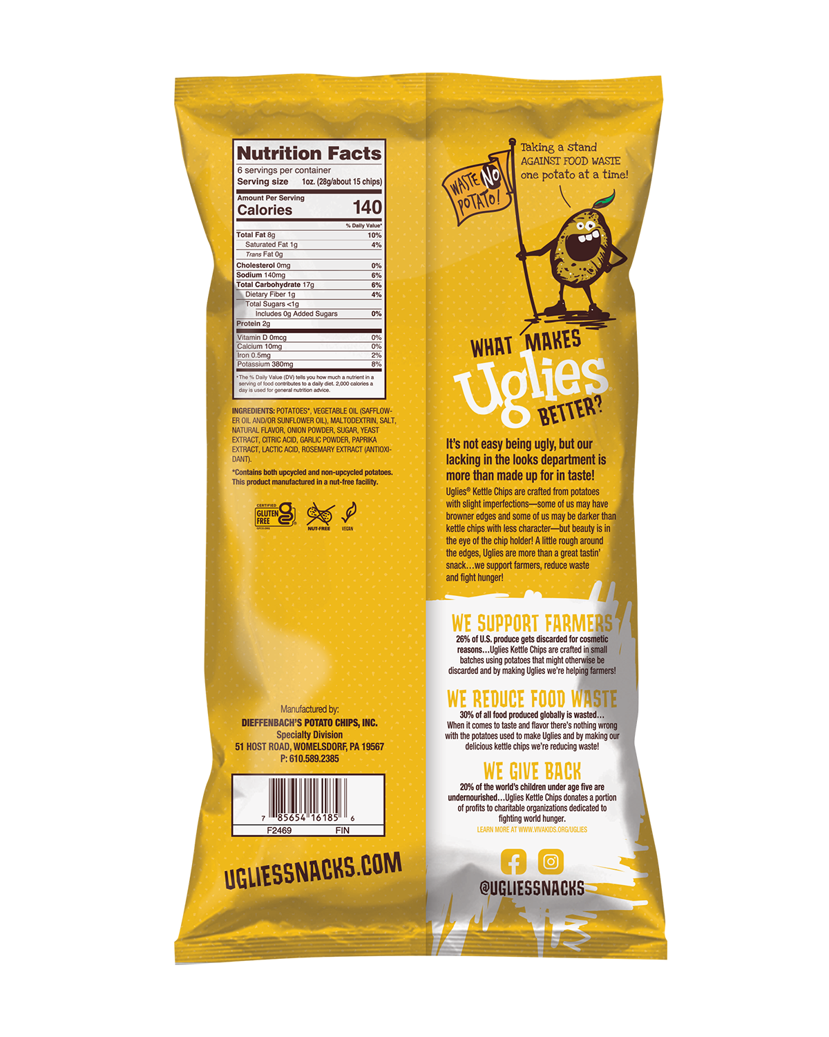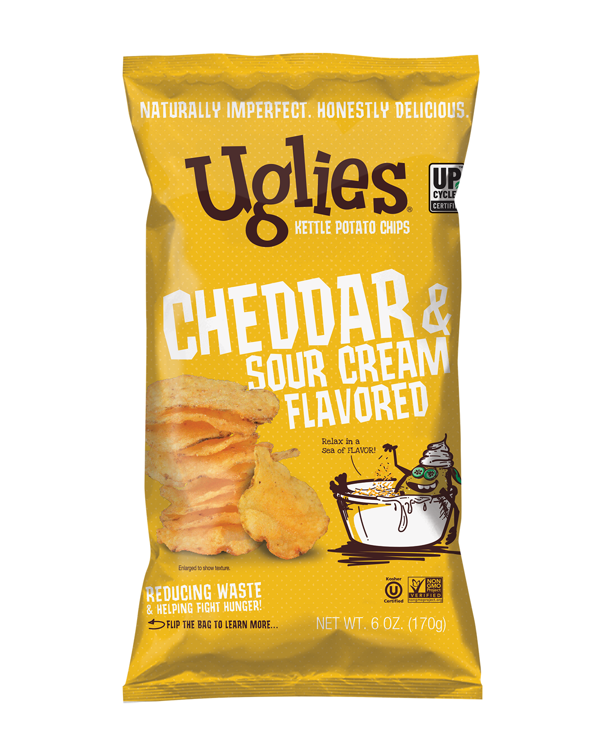 With or without dip, Uglies Cheddar & Sour Cream Kettle-Cooked Potato Chips are packed with more flavor in every bite! This popular flavor is cheesy and savory but, best of all, potatoes are saved in the process!